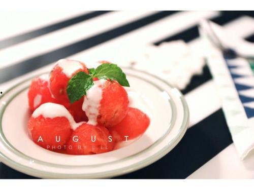 酸奶瓜盅:将瓜切成两半,挖去瓜瓤,填入酸奶和水果粒,既美观又美味。